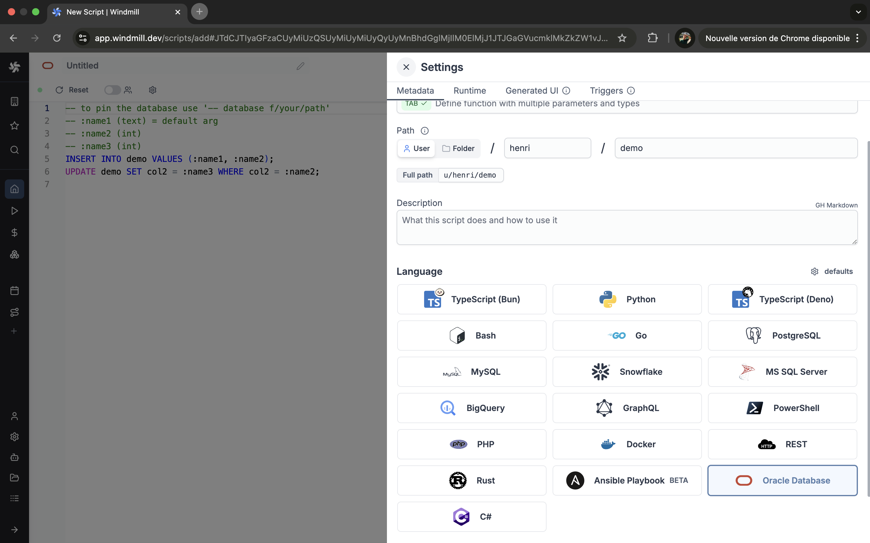 Pin database resource path directly within a SQL script instead of filling it through the UI.