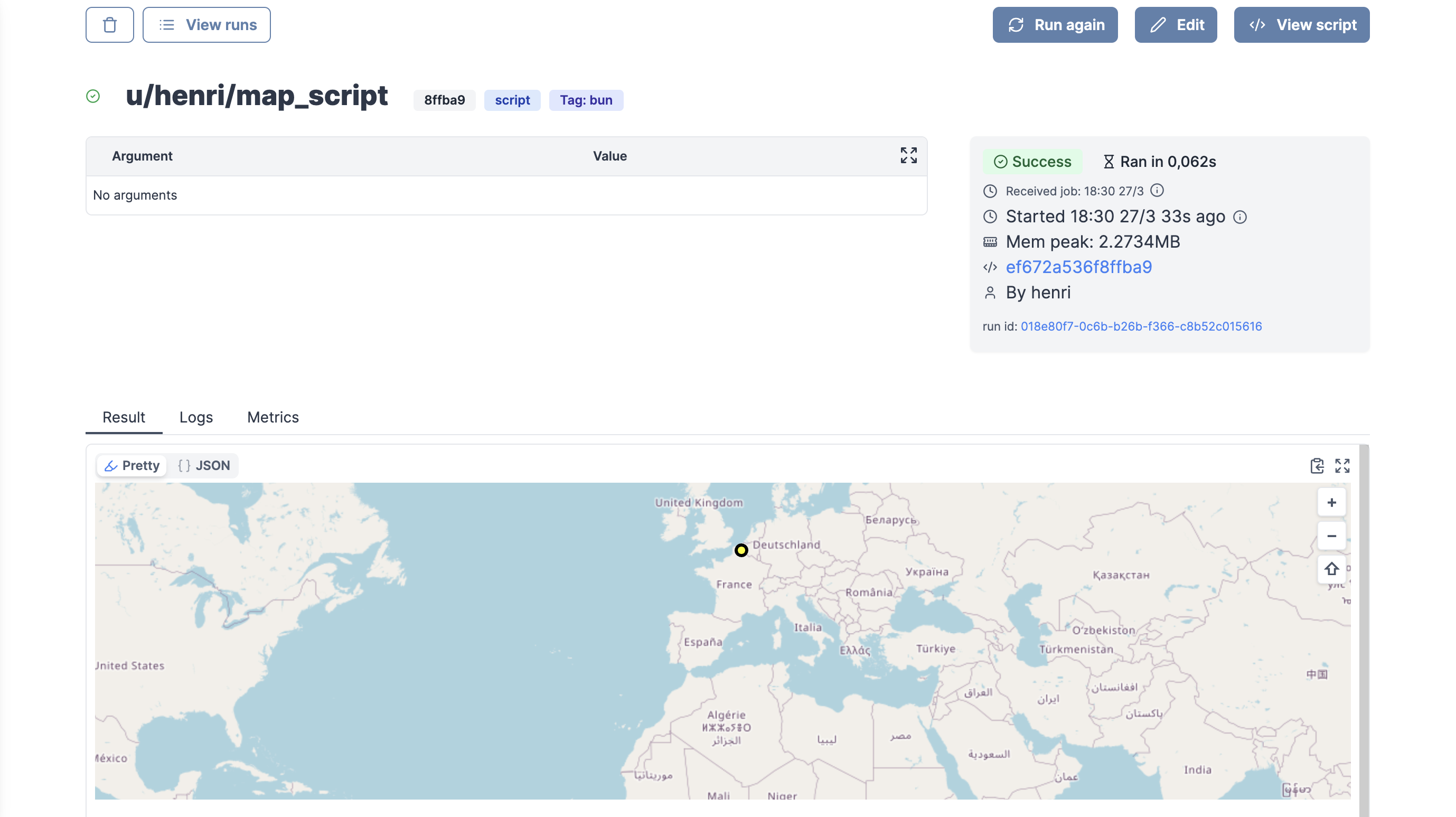 - Example: `return { "map": { lat: 40, lon: 0, zoom: 3, markers: [{lat: 50.6, lon: 3.1, title: "Home", radius: 5, color: "yellow", strokeWidth: 3, strokeColor: "Black"}]}`